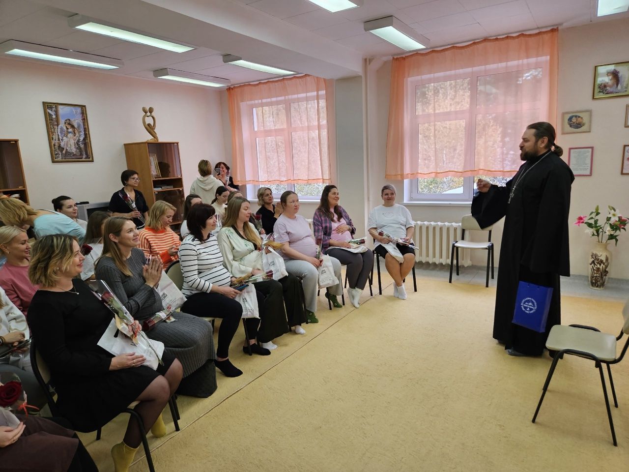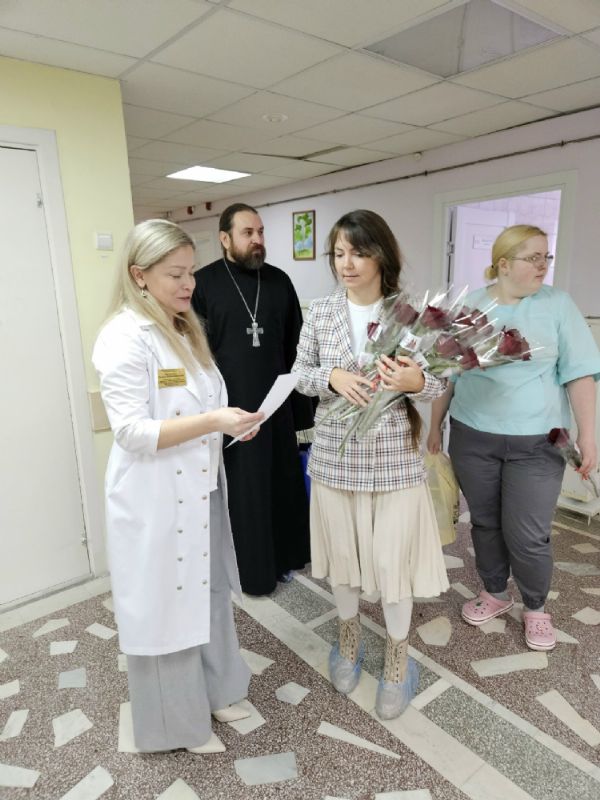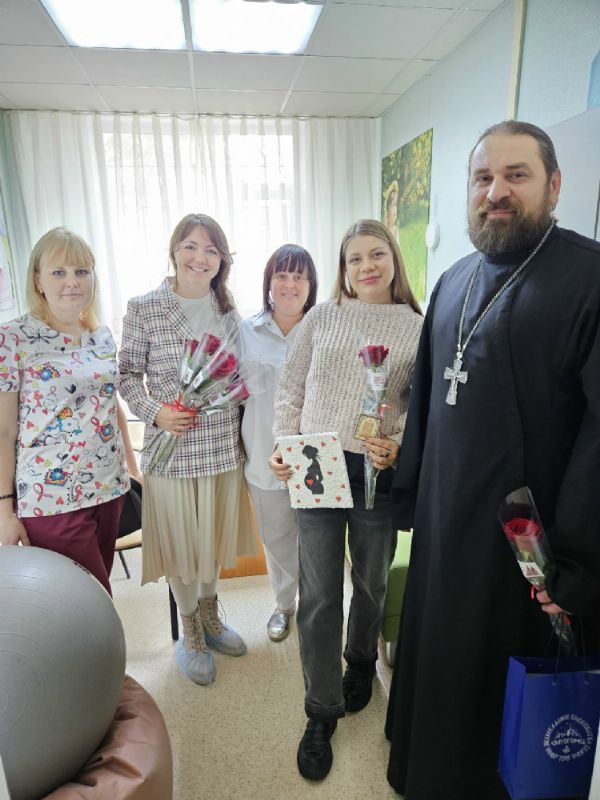 Завершился этот насыщенный день визитом в женскую консультацию, где в это время проходил мастер-класс для будущих мам. Отец Дионисий встретился с психологом и социальным работником женской консультации, а всем присутствующим снова дарили цветы.