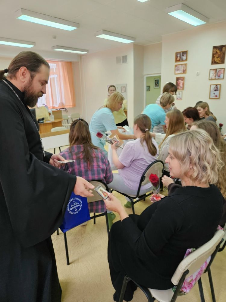 Священник провел для будущих мам душевную беседу, поздравил их с праздником, вручил цветы и небольшие иконы. В знак благодарности за труды персонал центра был угощён вкусными тортами.