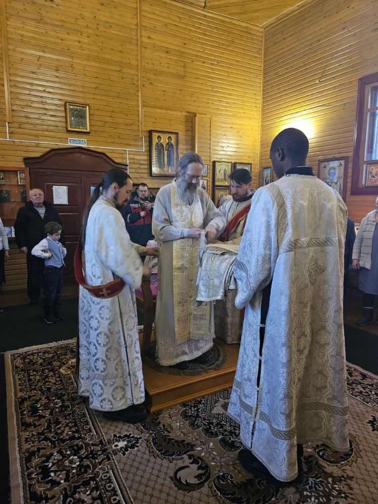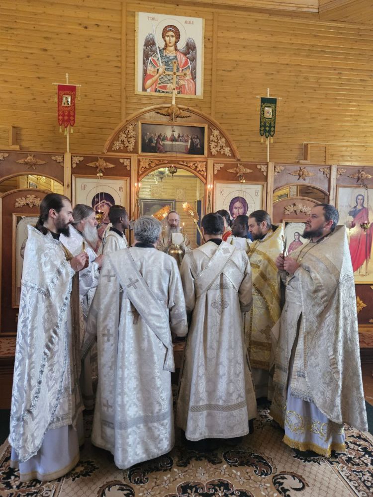 Его Высокопреосвященству сослужил благочинный Благочиния Томского района протоиерей Дионисий Степанов, настоятель Борисоглебского храма в с. Корнилово протоиерей Николай Абрамов, ключарь Богоявленского кафедрального собора иерей Олег Огнев, настоятель храма Архангела Михаила в с. Турунтаево иерей Константин Иванов, протодиакон Владимир Марков.